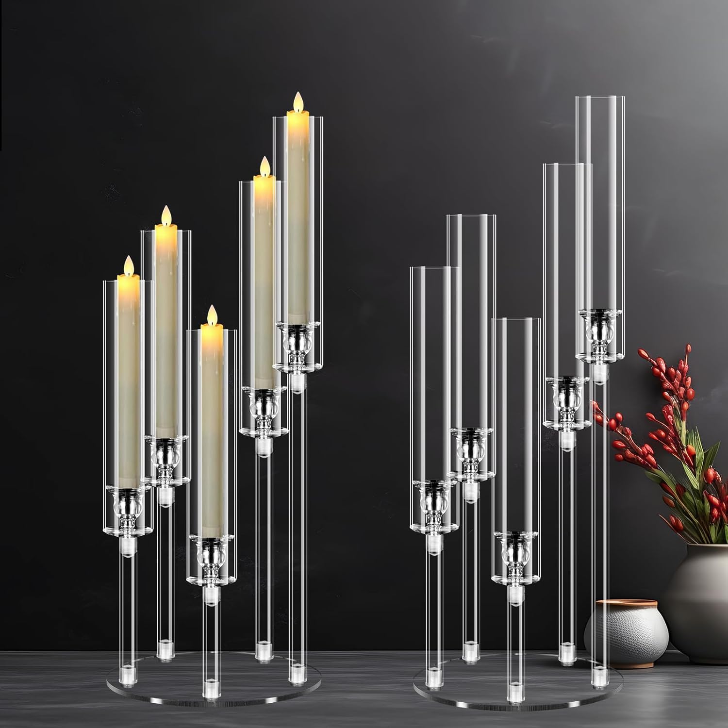 6 Sets 5 Arms Acrylic Candelabra Centerpieces for Tables ,Clear Candle Holder for Wedding,Ceremony Dinner Party, 22.8" Tall Candlestick Holders with Lampshade,Fit LED Candle