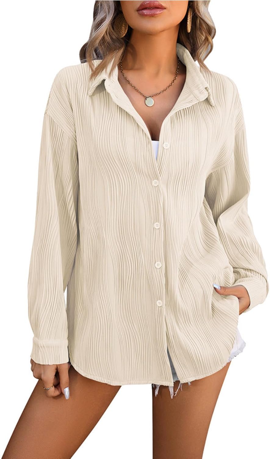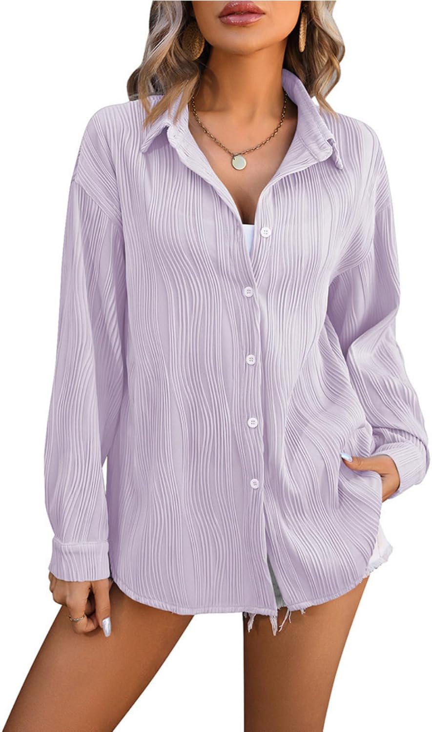 -Crafted from a high-quality polyester-rayon blend with distinctive wave texture, this blouse offers exceptional drape and movement for elegant everyday wear. The fabric features a subtle sheen that enhances the wave pattern while providing comfortable stretch for easy movement. -Designed with an elegant lapel collar that can be worn open for casual style or buttoned for a more polished look, complemented by the unique wave texture that creates visual interest throughout the garment. Features include long sleeves with button cuffs for adjustable fit, a loose silhouette that skims the body gracefully. -Perfect for vacation dinners, casual office days, weekend outings, and daily activities requiring polished comfort. The stylish design transitions seamlessly from sightseeing to business casual settings, from beach resort evenings to urban exploration. -Layer under blazers for professional settings, pair with tailored trousers for business casual, or wear with jeans for smart weekend style. The wave texture adds enough interest to stand alone as a statement piece while coordinating beautifully with solid-colored bottoms and accessories.